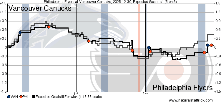 This game had its ebbs and flows, and it wasn’t like Vancouver had fully let the game slip out of reach at any point. They started out very strongly in the first, holding a 59.38 CF% and 71.71 xGF%, but obviously weren’t able to deliver on the promising share metrics. Unfortunately for this team, that proved costly, as a weaker second period allowed Philly to seize significant leads in both Corsi and expected goals metrics. Doubly so, as the Flyers actually made good on those advantages to get in front by two goals. That made it hard for the Canucks to fully get back into the game; although they played a competitive third, they needed to be much better to tie it up.