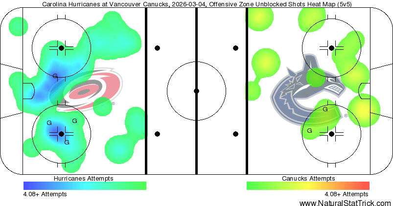 The heat map isn’t too horrific, especially when looking at where and when things happened throughout the contest. Carolina held a commanding 29-11 scoring chance lead with a 12-3 advantage in high-danger chances. However, 7 of those high-danger chances were in the first, with 11 overall scoring chances in the same span. If taking that into account, things actually weren’t the worst when thinking about how the second and third played out as well.