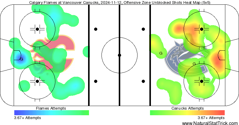 On the one hand, defensively, Vancouver managed to get back to their game. While Calgary isn’t exactly an offensive juggernaut, they were only held to 17 total scoring chances and just 4 high-danger chances at 5v5. That much is reflected in the heat map, with the only semblance of a hot spot coming in front of the crease, ever so slightly. On the flip side though, the Canucks still struggled to get a good number of high-danger looks themselves. Out of a total of 20 scoring chances, only 6 of them were considered high-danger. While Vancouver did relatively better than their opposition, it’s still a lot of the same patterns from this last stretch of games – and definitely something this team needs to improve.