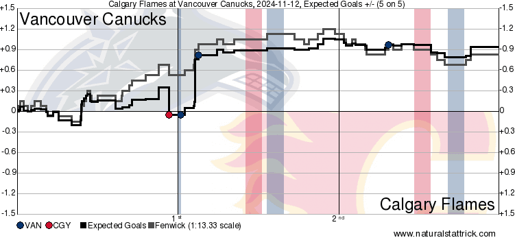 It wasn’t the strongest start to the game for the Canucks. Despite having a 62.16 CF% share over the course of the opening period, Vancouver only got a 48.53 xGF% share. This came with conceding a 1.01 xGA to the Flames, leading to them trailing 1-0 heading into the second period. That was apparently what it took to wake the Canucks up, as their xGF% shot up to 94.45%. They accumulated 1.17 xGF in the middle frame while only facing down 0.07 xGA, with a 7-2 scoring chance edge and a 3-0 high-danger chance advantage. That was all Vancouver needed to get themselves in the driver’s seat of the game, and while the third period saw them drop possession to a 25.00 CF% share, they still held Calgary to just a 0.37 xGF.