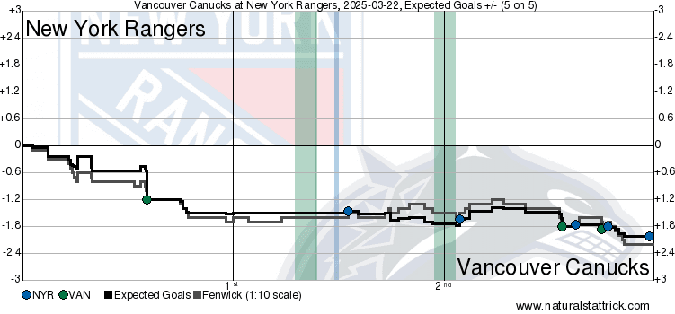 There was nothing in this game that suggested the Rangers ever got a lick of momentum. The first period set the tone for the Canucks, who posted a 73.53 CF% and 84.63 xGF%. It was absurd, with Vancouver tallying 1.86 xGF in the opening frame alone. Should they have capitalized on that more? Probably, but at the same time, it wasn’t as if they gave New York a path back into this game from the stats side – they just didn’t build more. The Rangers only posted a single period at 0.5 xGF, with the Canucks holding a handy edge in expected goals and Corsi shares that shouldn’t have resulted in 5 goals against.