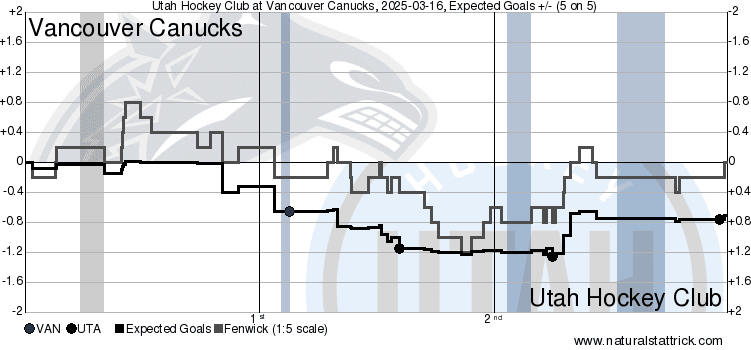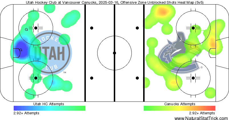 Just from looking at the heat map, it was apparent that the Canucks were outclassed. The overall scoring chances at 5v5 sat at 19-12 in favour of Utah, with the high-danger chances at 10-3. That much looks very apparent with the massive hot spot in front of the Canucks’ net and the lack of one on the other end. Simply put, it just wasn’t good enough at 5v5 to warrant winning this game. One of the worst indictments of the Canucks’ lack of scoring chances comes from looking at their powerplay. With six minutes in the third, Vancouver only managed one high-danger chance in a situation where they needed to score.