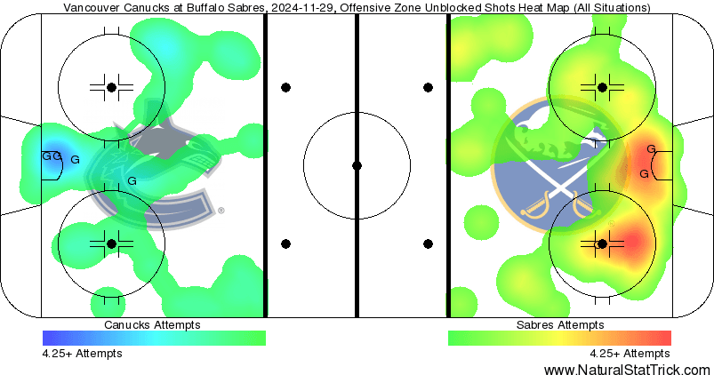 Did the Vancouver Canucks play a hockey game and again struggle to generate chances? Colour me surprised. Across all situations, the scoring chances stood at 28-17 for Buffalo while the high-danger chances favoured the Sabres by a 13-8 margin. The home team got most of that in the first and third periods, with 5 high-danger chances apiece. It’s reflected in the heat map too, where the Sabres definitely had a bigger and thicker spot than the Canucks did over the course of the game. The only consolation for Vancouver here besides the win is that they actually managed to get scoring chances on the power play – 4/8 of their high-danger chances came on the man advantage.