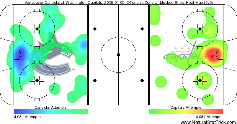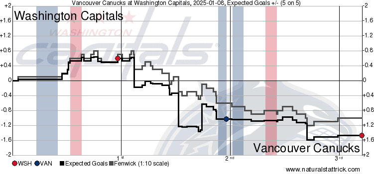 The Caps came out strong on their home ice, riding a good wave of their own Corsi and expected goals in the first period to score the opening tally of the game. After that, the Canucks were able to seize the initiative of the game. Vancouver would record a 59.09 CF% and 71.81 xGF% in the middle frame, totaling a huge 2.67 xGF while getting 9 high-danger chances at 5v5. The third was similar on the share metrics side, with the Canucks splitting the CF% 50-50 but getting a 73.37 xGF%, though the raw numbers weren’t as massive as those in the second period. However, they were unable to capitalize on that, and overtime was enough for Washington to secure the overtime winner.