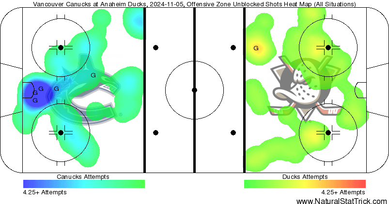 The heat map reflects the effort that Vancouver put forth at both ends of the ice. They held a 32-11 scoring chance lead with a big 15-2 edge in high-danger chances across all situations, showing the disparity between the two teams last night. The Canucks further had a 23-7 scoring chance lead and a 10-1 advantage in high-danger chances at 5v5. That much is reflected in the visual too, with Vancouver having a deep blue concentration in front of the Ducks’ net, while Anaheim couldn’t manage a single hot spot against.