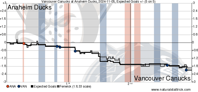 The first period looked a little dicey to start. With Anaheim getting on the board first, Vancouver was trying to get back into the game and establish themselves territorially. While the raw chances weren’t stacking up yet, the Canucks still held a handy share with 62.50 CF% and 73.54 xGF%. The second was where Vancouver really put things together though, racking up 1.49 xGF to Anaheim’s 0.18 and a 5-1 edge in high-danger chances. That to go along with a 76.47 CF% meant that the Canucks were able to take the momentum and help add to their lead as well as closing out the game in the third. Vancouver didn’t give up much of anything, controlling a 78.69 xGF% in the final frame.