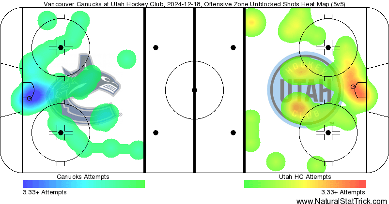 The heat map reflects the limited amount of chances that both teams managed to muster up last night. In total at 5v5, Utah held a 26-20 edge in scoring chances and a slim 9-8 advantage in high-danger chances. That difference is minimally noticed from looking at the heat map, with both teams posting a similar hot spot from in tight around the crease at a similar concentration. Overall in all situations, Utah’s lead shrunk to 35-31 for scoring chances, but grew slightly in high-danger chances with 13-11. Still, not a lot of action during the game to say the least.
