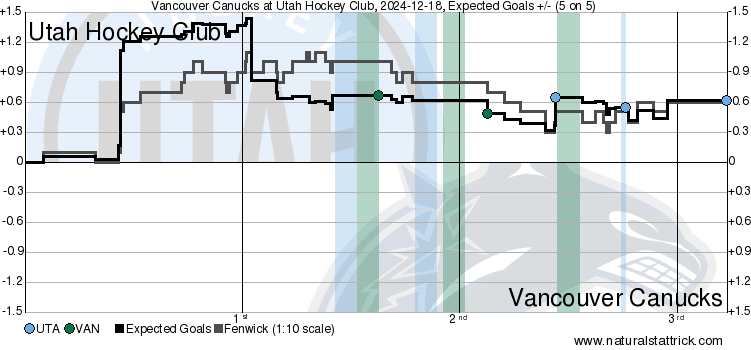 Utah had the game in their palms during the first period. Posting a 73.68 CF% and 90.68 xGF%, they had a huge 7-1 lead in high-danger chances to rack up a total of 1.52 expected goals in the opening period alone. The Canucks were fortunate to escape their less-than-serendipitous start without giving up a goal against, finding their footing in the game after the first intermission. Well, if it could be called finding their footing. Vancouver answered back in the second with 77.48 xGF%, posting a raw 1.08 xGF, but only managed 4 high-danger chances during that span. They would split the xGF% near dead even in the third despite having a 3-1 edge in high-danger chances, which unfortunately saw Utah find enough to even up the game on the powerplay before ending it in overtime.