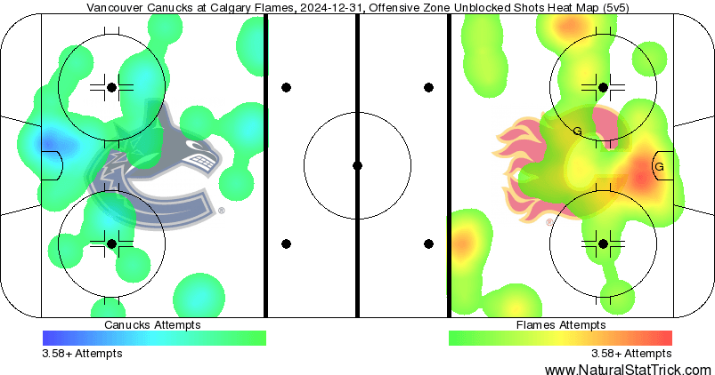 It’s another game where the Canucks couldn’t create scoring chances. In fact, the team got demolished at 5v5, to the tune of 26-12 for the Flames in overall scoring chances and 11-7 in high-danger chances. It got marginally better when factoring in all situations, with the Flames’ lead shrinking to 29-24, but the high-danger chances only jumped to 11-8. It shouldn’t be a surprise that Vancouver’s hot spot suffers from a size problem, not really able to get the puck into those spots much last night.