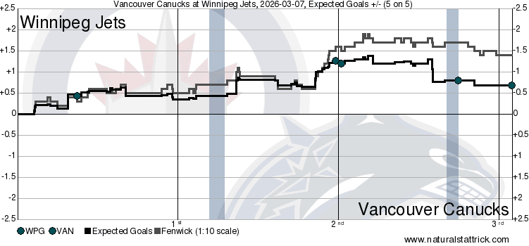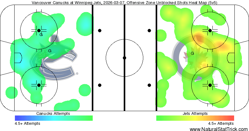 The heat map showed that the Jets had a handy advantage in overall scoring chances, but weren’t actually able to translate that into a big high-danger chance lead. At 5v5, they doubled up on the Canucks to the tune of 31-15 scoring chances, but that only turned into an 8-7 high-danger advantage for Winnipeg. The lack of true hot spots for either team showed that, visually, and realistically, the Jets got most of their HDCF in the second. The Canucks actually managed a 4-2 lead in the first and a 3-1 edge in the third, lacking the ability to capitalize on the couple of grade A chances they secured.