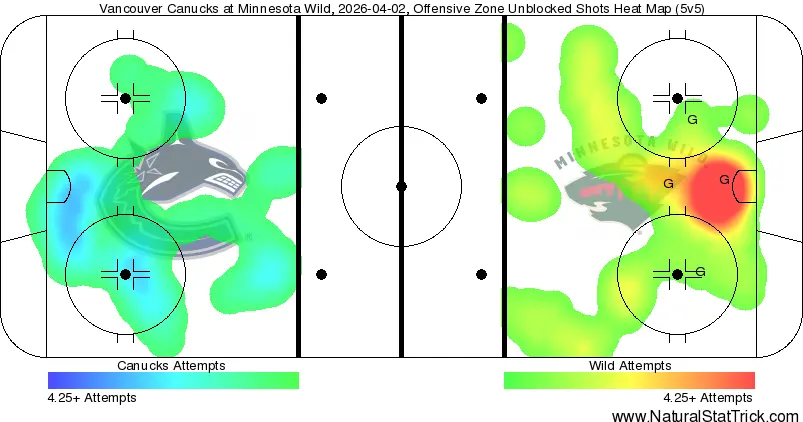The heat map also provides an illustration of which way the ice was tilted last night. In total, Minnesota racked up a 31-22 lead in scoring chances and an 18-10 high-danger chance lead. That was seen in the proverbial lake of fire right in front of the crease against the Canucks, who had to contend with plenty of high-danger opportunities all of last night. The large majority of those 18 high-danger chances came in the third, with 10 of them by Minnesota in the final frame alone. Vancouver simply stopped being able to keep up at a certain point, and their much stronger opposition took full advantage.