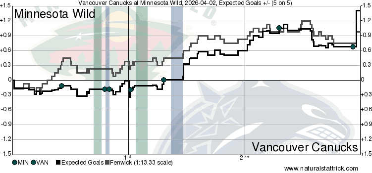 The first period, relatively speaking, was the one where the Canucks were the closest against the Wild. Despite giving up a 36.11 CF%, Vancouver actually managed a 50.61 xGF% with just a 1-3 deficit in high-danger chances, coming out of the opening frame with a 2-1 lead. Unfortunately for the Canucks, that was all the offence they would generate on the night and the high point of the contest, as it was pretty much one-way traffic after the first intermission. It wasn’t even close at 5v5 play as the Wild would proceed to post a 67.15 xGF% in the second and a 68.80 xGF% in the third. That third period also saw the Canucks get absolutely bled by a 10-4 margin in high-danger chances, with the Wild burying any hope the Canucks might’ve had in coming back.