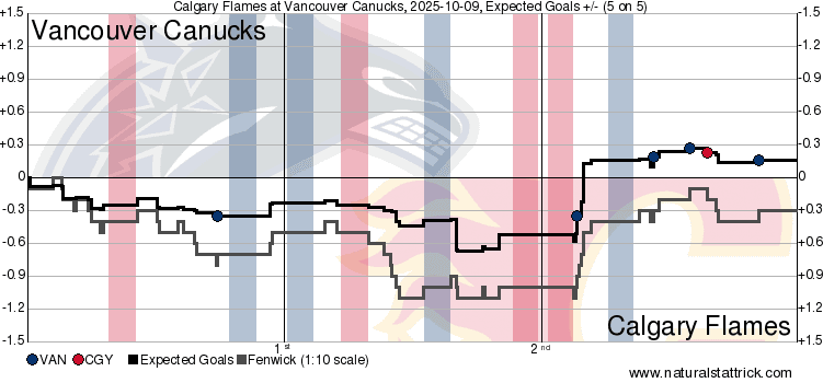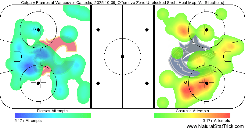 The heat map plays into the story told by the game flow. From this chart, it’s clear that the Canucks weren’t able to establish much in the way of a hot spot from a high-danger area. And no wonder – at 5v5 play, Vancouver saw a 12-14 deficit in total scoring chances with a slight lead in high-danger chances at a 4-2 margin. Simply put, that’s not a lot of offence at even strength play, and with 40:45 minutes of 5v5 action, it’s pretty poor numbers. At the very least, the Canucks were able to stymie the Flames defensively in return.