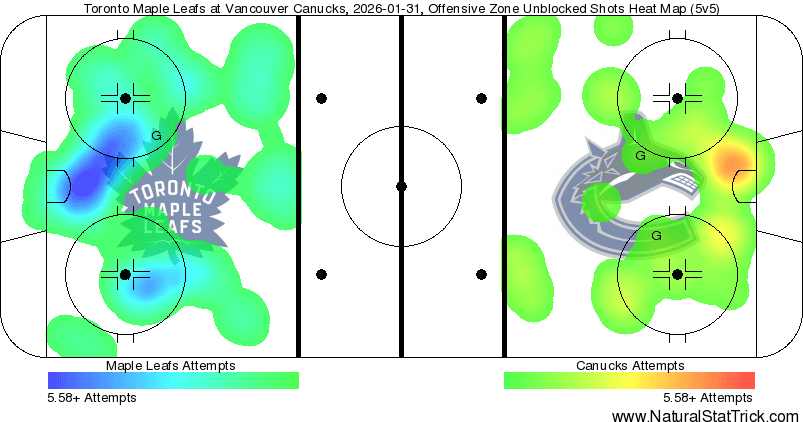Given how one-sided the expected goals were, one might’ve expected to see a worse heat map than this one in front of us. At 5v5, despite Toronto holding a 38-20 overall scoring chance lead, the Leafs’ high-danger chance margin was just 14-10. The bigger hot spot obviously is to be expected, but the density of the hot spot for the Leafs wasn’t all that much more than the Canucks. Again, it’s not much consolation given how many chances and expected goals Vancouver was bleeding, but it’s very much a case of “hey, it could be worse.”