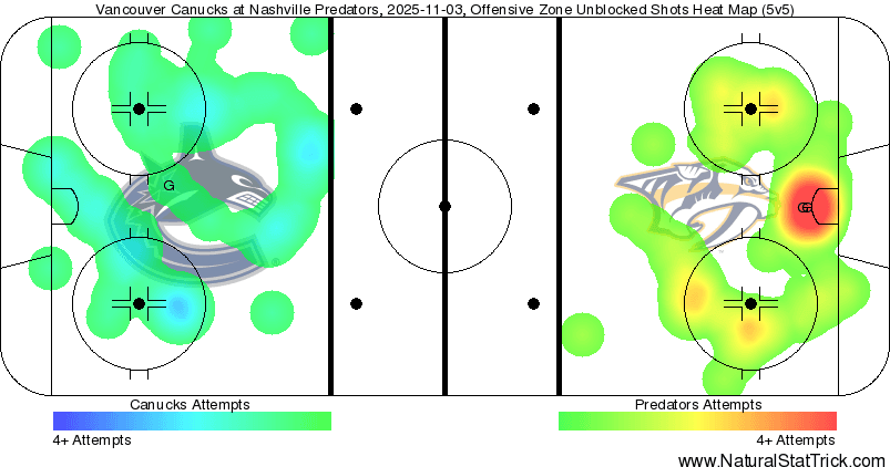 At 5v5 in regulation, this game relatively favoured the Preds. Nashville had the 20-13 scoring chance advantage with a 9-6 high-danger chance lead, reflected in the concentrated hot spot they had in front of Thatcher Demko. That, however, isn’t a lot of raw numbers when it comes to scoring chances against. That much can be some solace for the Canucks, that they didn’t give up a whole lot of opportunities in total. In relation to their opposition, however, they were on the back seat during even-strength play. At least, when accounting for all situations (including power play and 3-on-3), the numbers evened out, where Vancouver was down 24-26 in scoring chances up up 12-11 in high-danger chances.