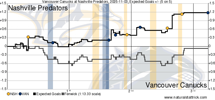 The only period all of last night where the Canucks weren’t on the statistical back foot was the first. Vancouver held a narrow 51.43 CF% edge and managed 47.42 xGF% for the near even split. After this, it was genuinely all Preds. Nashville recorded a 62.71 xGF% in the second before going on to record an 82.55 xGF% in the third, where they didn’t allow a single high-danger chance against while posting 4 of their own. The Predators were running circles around the Canucks after that 5-on-3 power play Vancouver had in the second, with the home side totalling 1.76 xGF in the second and third put together, while the Canucks only had 0.66 xGF in the same span. Suffice it to say that at 5v5, Nashville had a much better body of work through the majority of the game.