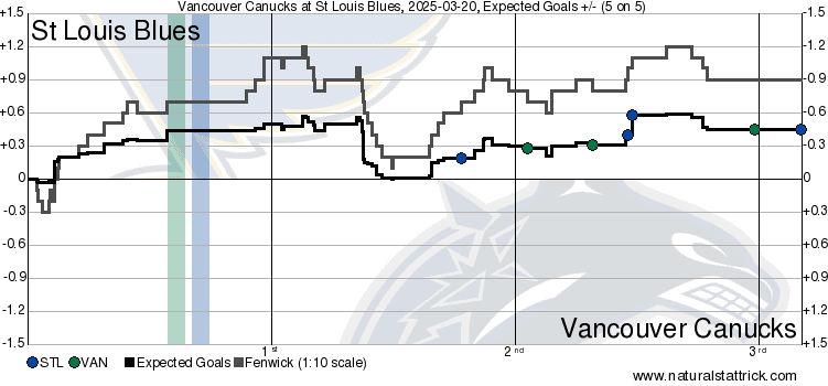 The Vancouver Canucks lost 4-3 in overtime against the St. Louis Blues. There was plenty of action on the scoreboard with a clutch Brock Boeser clap bomb that sent this game into the extra frame. But taking this game into context away from the goals, and the stats shows a pretty low-key affair. Neither team really managed to get all that much going in expected goals or scoring chances, with the players capitalizing against how the probabilities were going for the majority of the night.