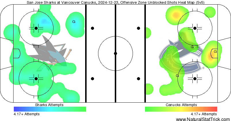 There weren’t a lot of scoring chances to speak of in this game. At 5v5, the Sharks barely edged the Canucks out 13-12 in total chances, with San Jose also having a 6-4 lead in high-danger chances. Accounting for all situations, the numbers jump to 31-23 chances for the Sharks but 11-9 high-danger chances for the Canucks. The heat map reflects the lack of action at 5v5, with a large portion of the special teams numbers due to the 5-on-3 advantages that each team was able to have. Not the worst thing in the world, but if you’re the Canucks, you want to be producing a lot more than 4 high-danger chances at 5v5 against a team like the Sharks.