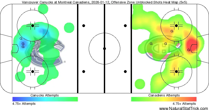 Overall scoring chances saw the Canadiens take a 36-23 lead at 5v5, though the high-danger chances were relatively more in reach with just a 10-8 edge for the Habs. The Canucks actually did a relatively good job of capitalizing on the high-danger chances that they managed to generate, with all three of their goals coming at 5v5 and from right in the low slot area. However, the sheer number of chances that the Habs had proved to be overwhelming, and in the end, was too much for the Canucks to overcome.