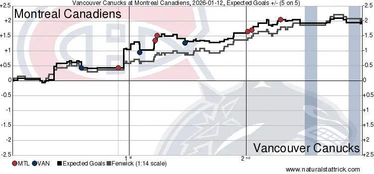 The game flow was heavily skewed towards the Habs, and for good reason. There wasn’t a single frame where they finished below 62.00 xGF%, and they never had a disadvantage in Corsi either. Simply put, they were consistently generating chances, consistently retaining the puck, and dictating the pace of the game. Vancouver didn’t have an answer, though they managed to capitalize on the handful of opportunities that they got to keep the game knotted up at three. Unfortunately, Montreal just took it to a different level in the third, and the Canucks couldn’t manage to keep up.