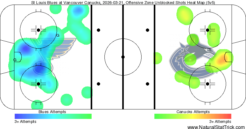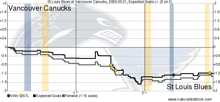 The first period numbers have to be seen to be believed. Vancouver would finish the frame with a staggering 9.52 CF%, which is just obscene to think about. The visualization for that would be that the Blues had the puck for just over 90% of 5v5 action, which just shouldn’t be happening in the NHL. Fittingly, the Canucks also recorded a 6.59 xGF% in the first, which just feels like a season’s worst. The second period was marginally better, but considering that the benchmark was subterranean, there was nowhere to go but up. Vancouver posted a 33.33 CF% and 30.55 xGF% in the second, giving up a big 0.66-1.51 xGF tilt during 5v5 play. The Canucks did have the stats favour them more in the third, with a 59.09 CF% and 65.55 xGF%, but it was clearly not enough, and the team’s raw production wasn’t enough despite them scoring against the flow of the game.