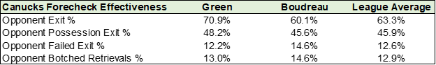 Based on this information, we see that Boudreau has improved the Canucks’ forecheck efficiency across the board. The team is now allowing drastically fewer exits overall and slightly fewer possession exits, while also increasing the frequency with which they cause failed exits and botched retrievals.