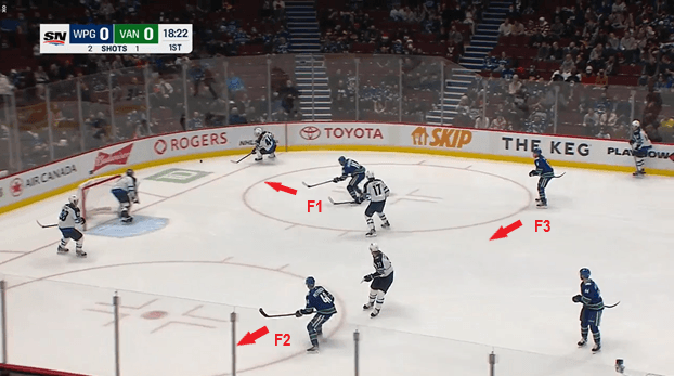 As Josh Morrissey retreats back into the Jets’ zone, Jason Dickinson (F1) follows Morrissey closely to try to pressure the Jets defenceman and force him behind the net. Pettersson anticipates this and is prepared to seal off his own side as he thinks he’ll be the strong-side F2, while Boeser is playing more centrally, ready to take the F3 spot in the middle of the ice:
