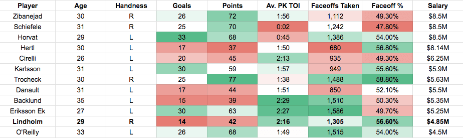 I’ve analyzed and compared Lindholm’s stats from this season to 11 others that fit his similar faceoff ability, goal-scoring totals, and defensive/penalty kill deployment to help gauge what his upcoming contract should look like.