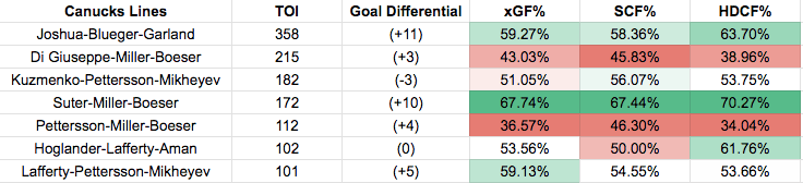 In terms of the Canucks lines, here is where they rank among all lines this season that has played 100+ minutes together.