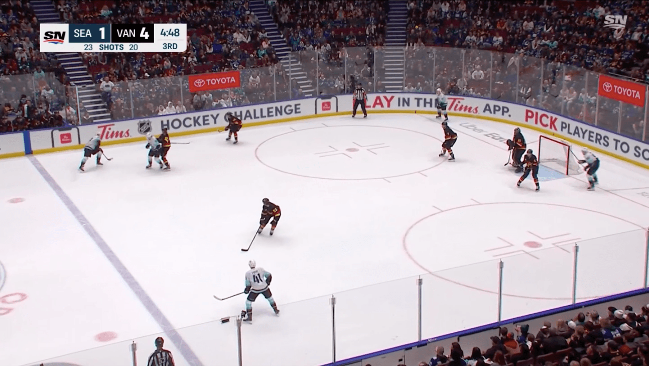 After that shift, the Kraken would get some offensive zone time and pull their goalie. The Canucks did a good job at limiting their pressure to the outside for two shifts. They even had an opportunity after a nice play to set up Derek Forbort with open space to feed Kiefer Sherwood for a rush chance the other way with an open net. However, Sherwood had most of his space limited by two backchecking Kraken forwards and the pass to Danton Heinen was intercepted.