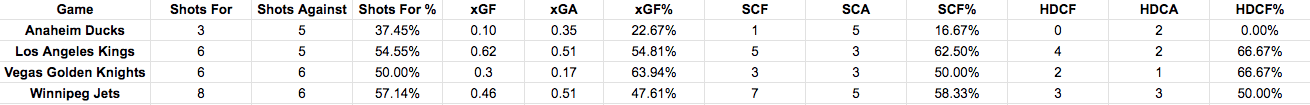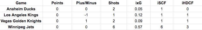 The outlier for this line is the game against the Anaheim Ducks, in which they were heavily out-chanced. They allowed more shots than they registered, leading to more scoring chances against (SCA) and, in turn, higher expected goals against (xGA) than expected goals for (xGF).