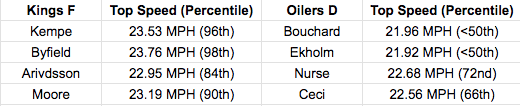 The long stretch passes seem to work against these Oilers defenders. The Kings’ speedy wingers like Kempe, Byfield, Arvidsson and Moore had no problems sneaking past the top four defencemen. Here are the top-speed comparables with data provided by NHL Edge.