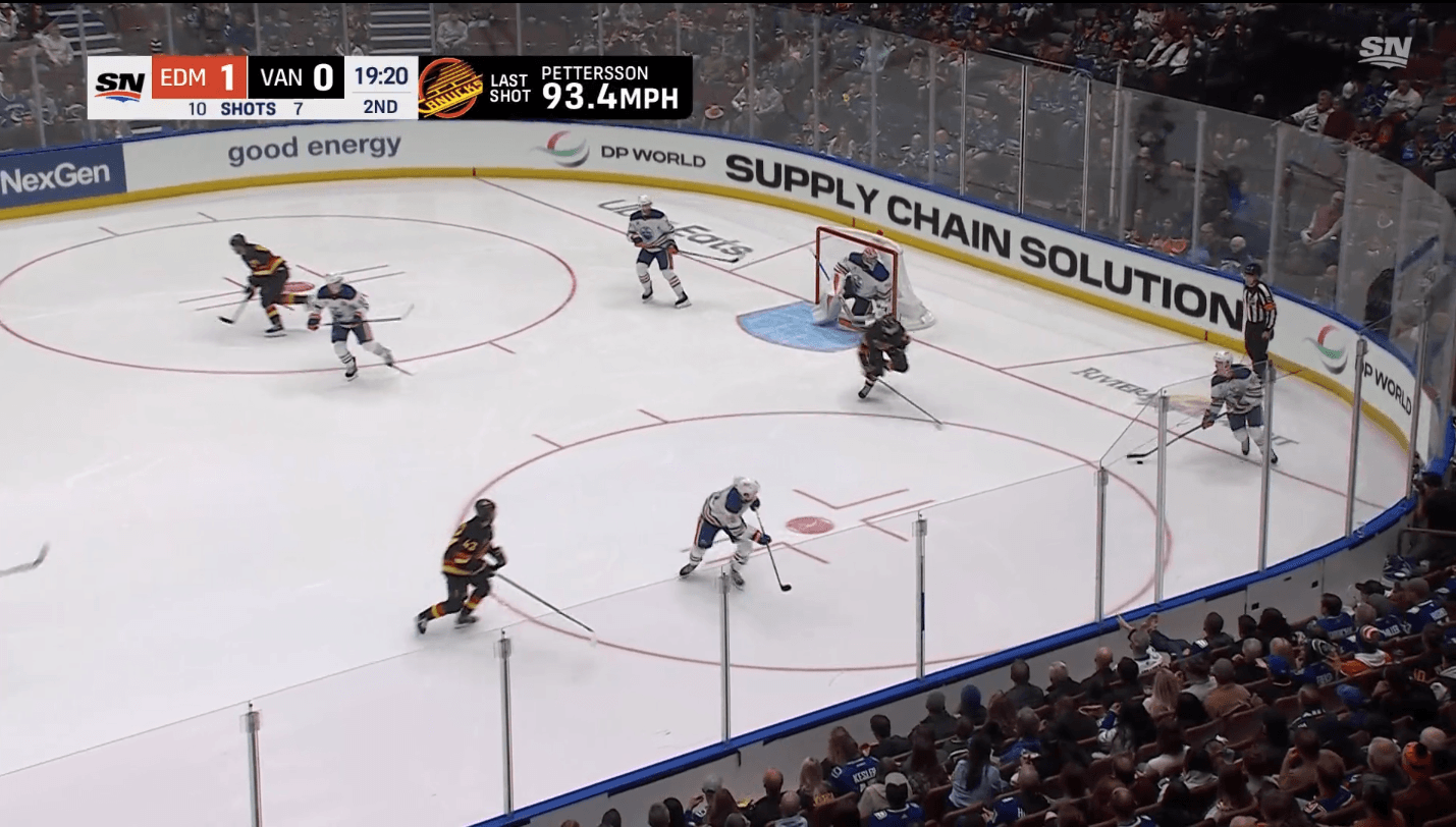 As he skates with the puck through Gretzky’s office, a defender is quickly on him. Pettersson gives him one of his patented reverse hits, stumbles over, but makes an athletic play to kick the puck up in his feet and up to his stick. With another Oilers defender on him, Pettersson finds Filip Hronek at the point. Continuing to move his feet with urgency, Pettersson goes straight for the middle of the ice to become a threat and isn’t afraid to take the contact that comes with being in that area of the ice.