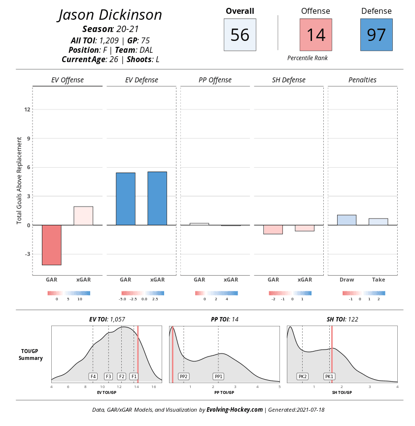 Dickinson shifted around Dallas’ middle-six last season filling in as the team’s 3rd-line center and 2nd-line left winger while putting up impressive underlying defensive numbers. According to Evolving Hockey, Dickinson was in the 97th percentile for defensive value in their model.