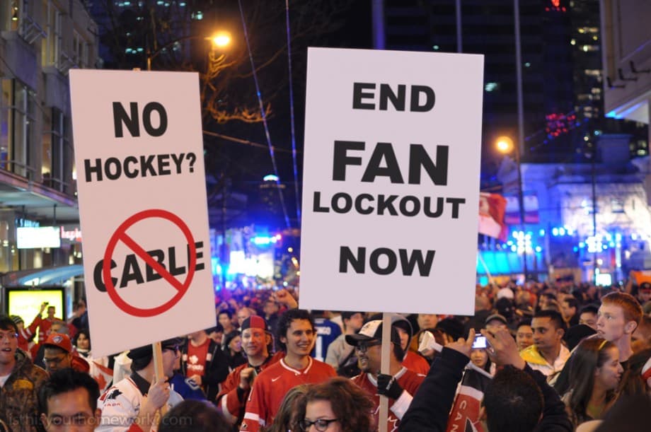 Cancelling your cable *until* the lockout ends? Doesn’t that undermine the point you are trying to make? The owners know you’ll be back, ready to pay for your cable. No, the way you take charge is not buy merchandise, to not pay for the fancy cable extras – yes, no NHL Centre Ice or NHL Network – or even paying attention to team sponsors. It means taking charge of what you do when you go to a game (if you are willing to go at all). Don’t pay for anything that can be considered what Jonathan Willis has called ‘auxiliary streams of revenue.’