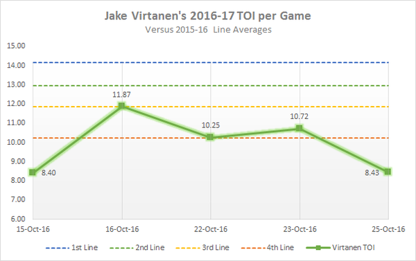 This chart shows Virtanen’s ice time over his five games this season, plotted against the average 5-on-5 ice time of first, second, third and fourth liners (derived from the averages of the first, second, third and fourth groups of 90 players that played at least 400 5-on-5 minutes in 2015-16 sorted by average TOI).