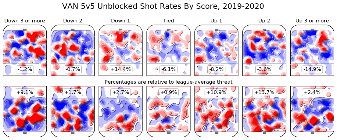 Each individual section notes the team’s threat for and against versus the league average in that score state. There are a couple of fascinating takeaways here. One is the +14% offensive threat relative to league average while down a goal. The Canucks clearly know how to turn up the heat when chasing in a close game, and they can do it without giving up much defensively.