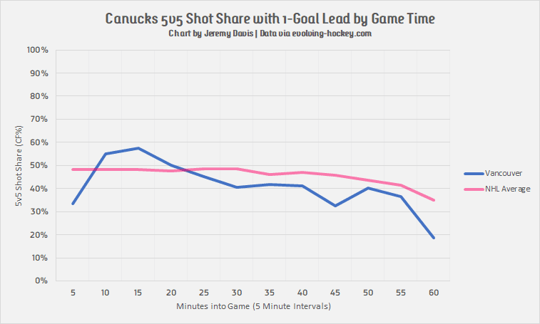 I’ve plotted the Canucks shot share (at 5-on-5 with a 1-goal lead) over the course of their games, along with the league average to compare against. The Canucks are particularly permissive in the last five minutes of hockey games, which is especially indicative that the team is desperately trying to go into all-out lock down mode and forego any offensive push.