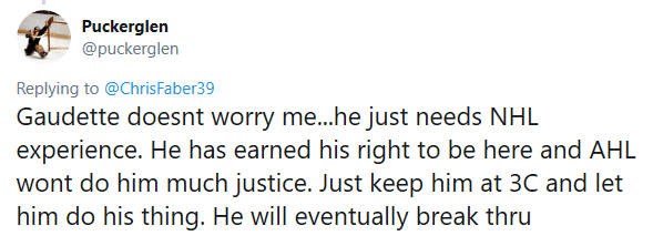 Gaudette did finish the final 16 games of the season averaging 12:35 of ice time per game and was only able to contribute two assists over that period so he definitely has work to do this offseason to improve his chances of being a full-time third line centre in the NHL. He did, however, have a higher Corsi for and goals for per 60 minutes and lower Corsi and goals against per 60 minutes than Brandon Sutter, who could very likely be Travis Green’s choice for the third line centre spot.