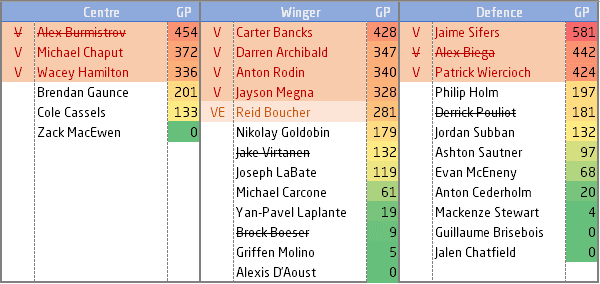 This is a major problem. What this means is that only five of Patrick Wiercioch, Anton Rodin, Darren Archibald, Michael Chaput, Jayson Megna, Carter Bancks, Wacey Hamilton, and Jaime Sifers will be able to play on any given night.
