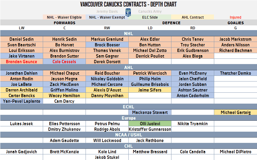 That is certainly still the case, and even though I got a couple of the assignments wrong (I had Brock Boeser and Jake Virtanen going to the AHL instead of Anton Rodin and Reid Boucher), the Comets still look like a formidable squad, perhaps even a Calder Cup contender. As you can see in the final depth chart below, there are plenty of players capable of putting up points in the minors.