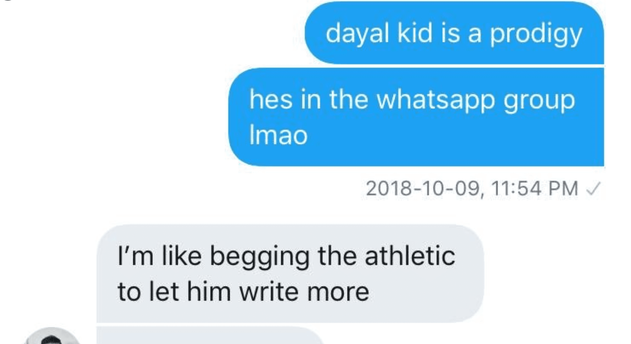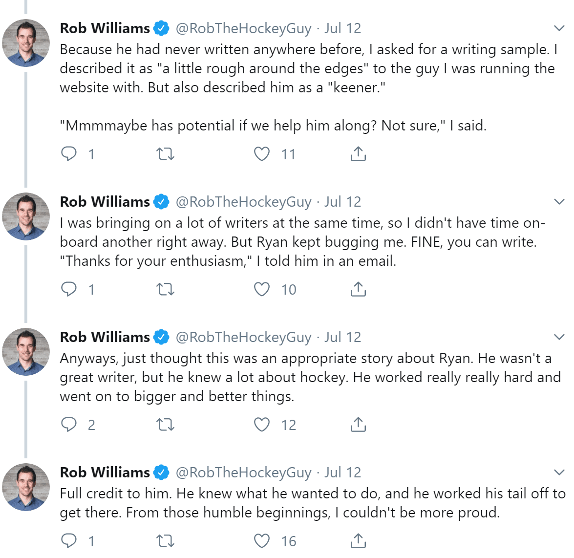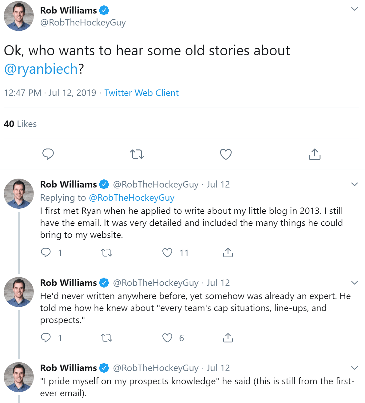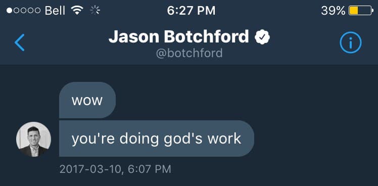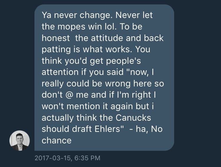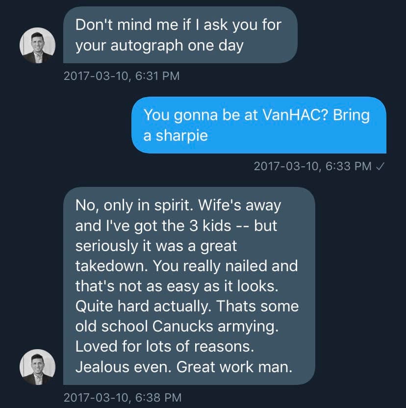 Publicly, I’m sure everyone remembers what he did for me. It all started with the “Boy Genius” nickname and he took every opportunity to pump me up. Athletties, Twitter, Patcast, TSN 1040, everywhere I went I saw he was raving about me and my ideas. Through the past eight or nine months my social media following has quadrupled and almost all of that is because of Botch. But it’s privately what he did for me behind the scenes that left the most impact. For starters, he helped forge the current opportunity I have at The Athletic. The first two stories I did for them was in September on Virtanen and then a later one on Stecher. At the time, there was no plans to bring on another contributor because The Athletic Vancouver already had Botch, JD Burke, Ryan Biech Halford, Brough and Israel Fehr. But Botch saw something in what I did and wielded all his power to make sure I’d continue getting my shot. I knew he was pulling for me behind the scenes, but it was only until someone sent me an old DM exchange they had with Botch that I realized how much he was doing.