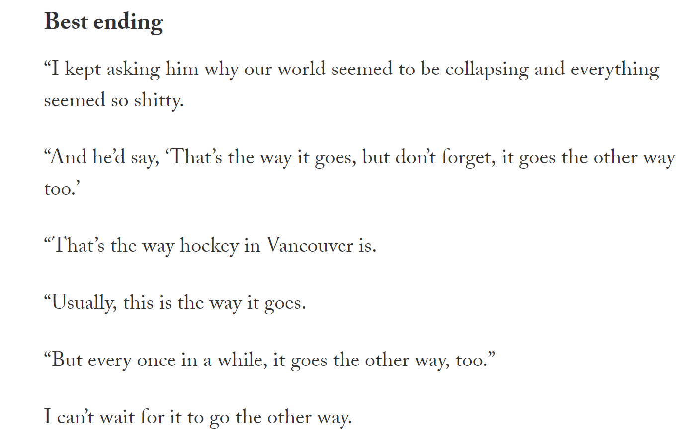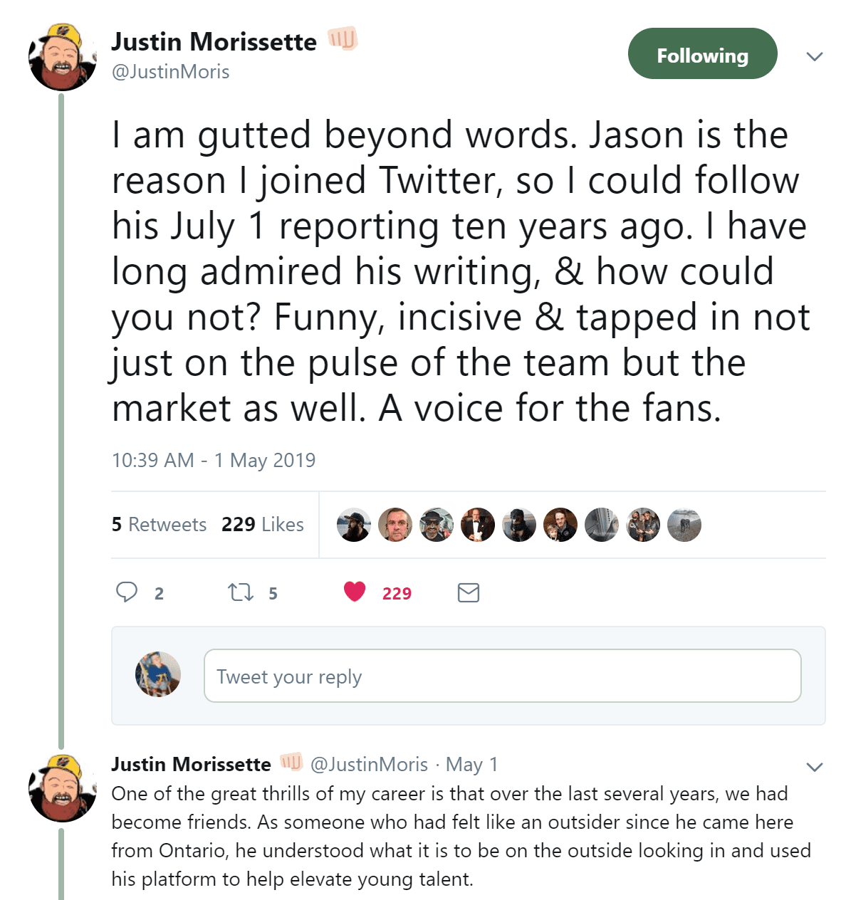 Jason and I would speak to each other regularly from that point on, usually to discuss the characters of Canucks Twitter that we’d recently fixated on. It was easily one of the best relationships I forged through writing and I’m gutted it was cut so short.