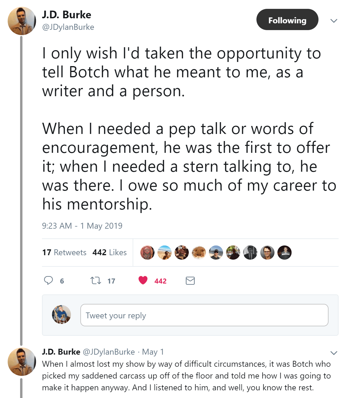 I had heard Botch’s wife, Katherine, planned to make a scrapbook of all the nice things we he had to say about her husband. I thought that maybe at the very least this could spare her some of that work, and if that’s all I achieved, it would be a success, even if the idea remained as bad as it was the day I conceived it.