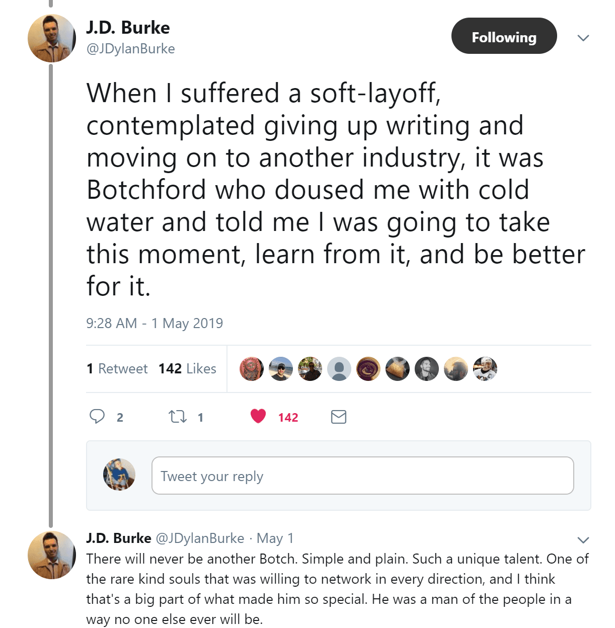 As it goes, Botch messaged with the news that he’d convinced The Athletic into giving me a shot as a contributor. He told me I’d need to perform well on my stories, but that he’d be on the ball in making sure I was on the right track with ideas and that he’d make sure he marketed the crap out of the work I did. And boy did he deliver. We talked every day and planned stories out months in advance. We were each others sounding boards. Through the highs and the lows of the season, he told me exactly what I needed to hear to stay on the right path. He got the most out of me like a coach would out of his players. Botch knew what the readers craved — he was the voice of their thoughts and feelings and made sure I was creating work that would resonate with them. Whether it was story ideas from the ground up, coordinating marketing strategies with the higher ups at The Athletic once the piece was done and everything in between, he was the conduit. He was a tremendous mentor and friend and there’s no way I’m at this point without everything he’s done for me.”