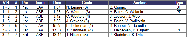 Abbotsford’s season-long power play woes continued despite the club’s double-minor in their favour, with Laval’s Nathan Légaré scoring shorthanded less than one minute onto the Canucks’ power play.