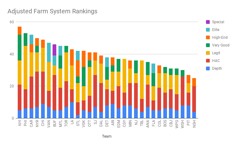 The results differed dramatically. Teams were rewarded more for having a large quantity of decent prospects than for having one or two elite ones. The Islanders leaped into first place thanks to their stellar 2018 class, while the Canucks and Sabres fell back 4 and 5 spots, respectively. Ranking for depth also meant teams were punished less for their top prospects graduating. For instance, Philadelphia fell just one spot from their place atop last year’s rankings, as opposed to the 11 they dropped in the actual rankings. ( I would provide more details regarding Pronman’s complete list, but the Athletic is a wonderful resource that relies on subscriptions for revenue, and I don’t want to go beyond fair use.)