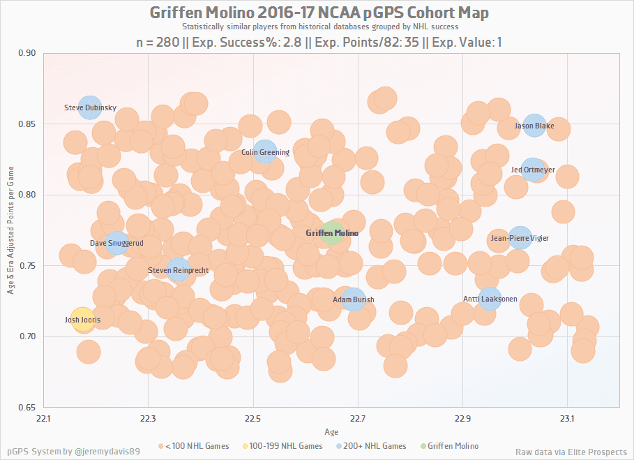pGPS is far from infallible, but it does have a pretty reliable record in the NCAA. Out of 280 matches, just a handful stuck around in the NHL, given Molino an expected likelihood of success of just under 3%. Those are very, very long odds.