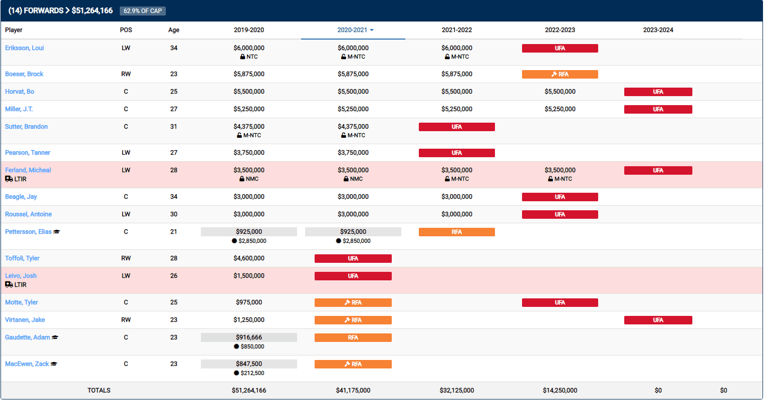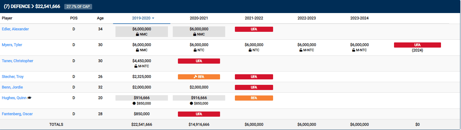 As a final, foreboding note, it should be mentioned that any long-term contract signed now has to take into consideration the possibility of a flat cap lasting for multiple seasons. The Vancouver Canucks will need to re-sign both Elias Pettersson and Quinn Hughes to massive new deals sometime before the 2021/22 season.