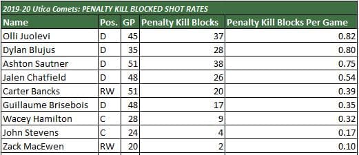 Through the tough shot differential, the Comets were able to maintain control of 47.7% of attempted shots with Olli Juolevi on the ice. It’s not much higher than the team’s total but Juolevi was used in a lot of defensive zone faceoffs as the Rafferty pairing would be thrown out for a lot of offensive zone starts. For the season, Juolevi’s Corsi percentage was just 0.1% lower than Brogan Rafferty, who had a tremendous season down on the farm. Juolevi’s most consistent defence partner was Ashton Sautner, whose CF% was 45.7 this year.